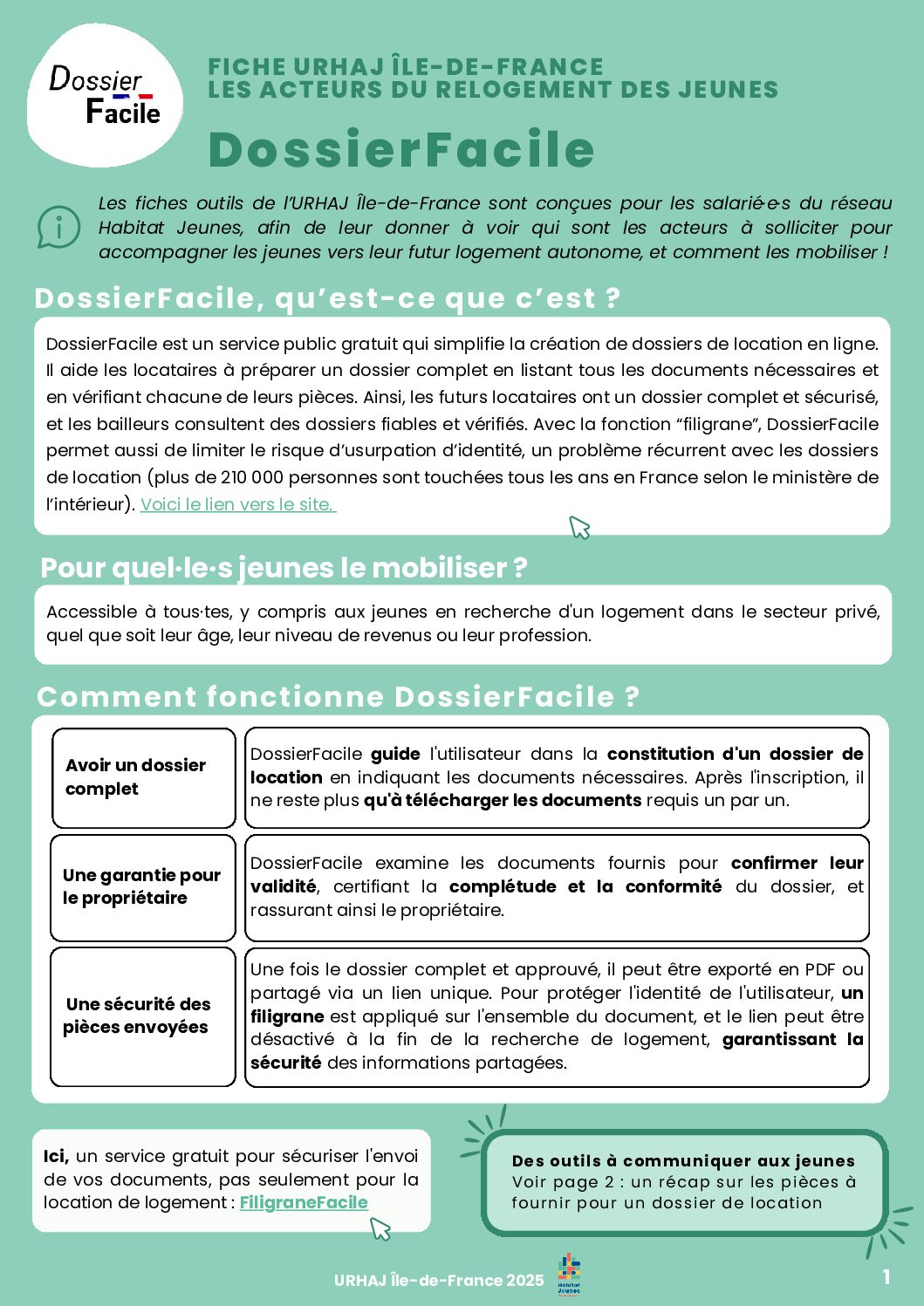 - DossierFacile : une plateforme publique et gratuite qui aide les candidat·e·s à constituer un dossier de location en ligne clair, complet et sécurisé. Elle fournit notamment la liste des documents obligatoires, examine et certifie la validité de chacune des pièces, rassurant ainsi le propriétaire ou bailleur. La fiche de l’URHAJ reprend le fonctionnement de la plateforme et informe les candidat·e·s sur les documents que le propriétaire n’a pas le droit de lui demander.